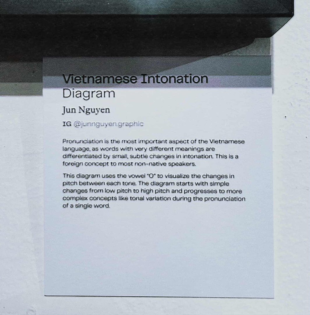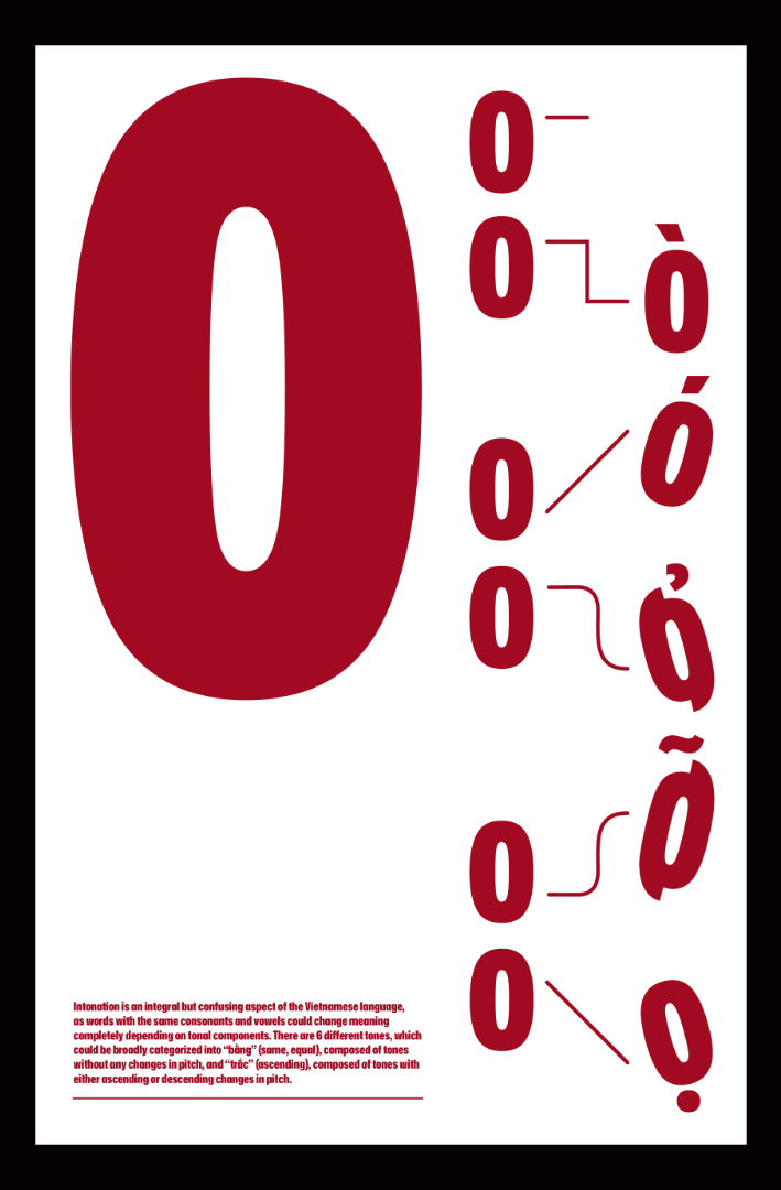 Intonation is an integral but confusing aspect of the Vietnamese language, as words with the same consonants and vowels could change meaning completely depending on tonal components. Using variations in letterforms and baselines, I aim to highlight the relative relationship between different vowels and tones, and show how adding accent marks would modify them.